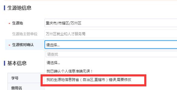 ⑥ 【生源地跨省修改】若生源地存在跨省错误,可在页面下方管理信息栏下拉选择“我的生源地跨省错误,需要修改”。